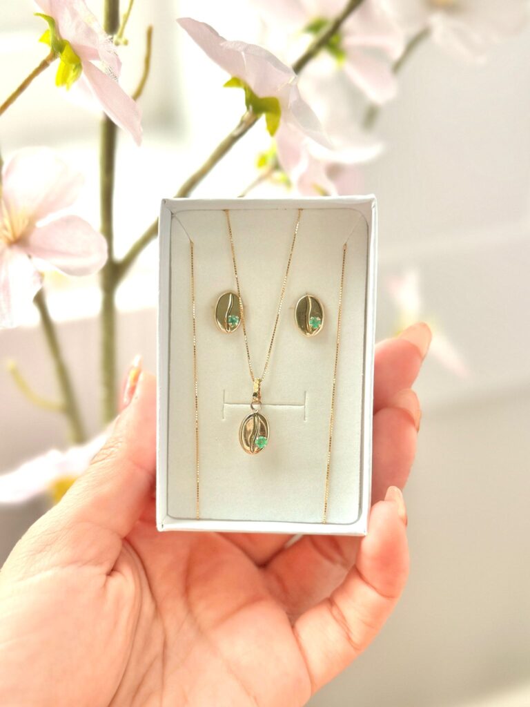 Experience the perfect blend of elegance and nature with this exquisite jewelry set. The kit includes a pair of earrings and a matching necklace, each featuring two finely crafted coffee beans in radiant gold. Nestled within each bean is a brilliant, high-quality emerald, symbolizing the richness of Colombian heritage and the beauty of its land.