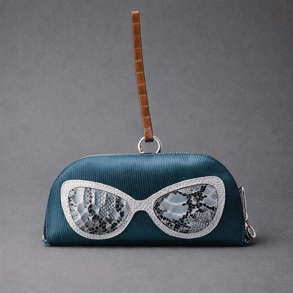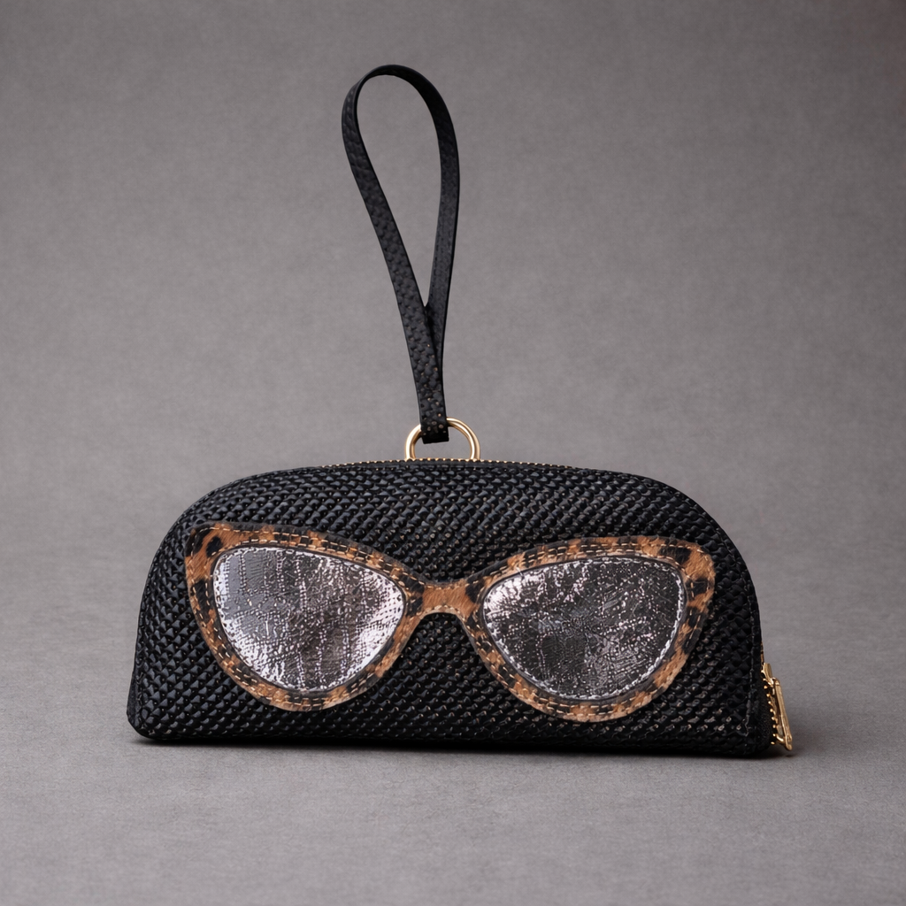 This glasses case is crafted from genuine textured leather, featuring a playful sunglasses design on the front that adds a touch of personality to your look. The semi-rigid shape keeps your eyewear protected, while the wrist strap makes it easy to carry wherever you go.
